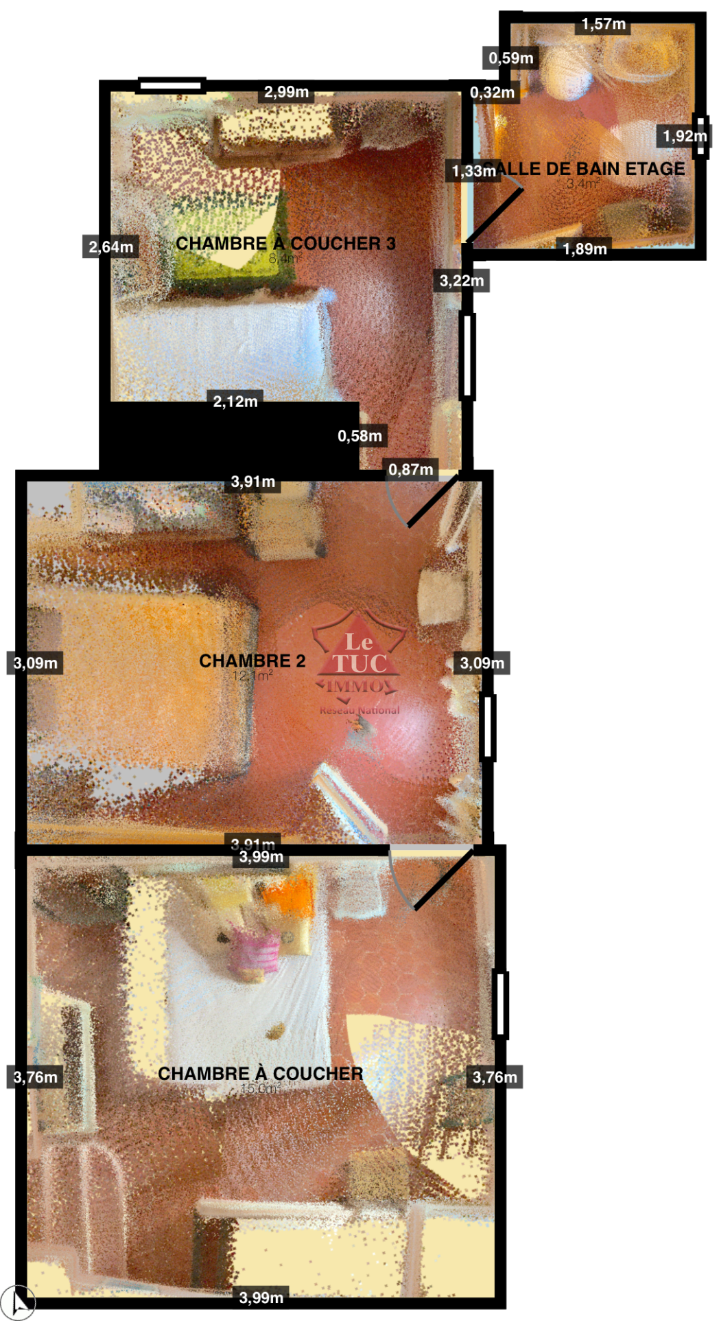 A l'étage trois chambres, salle de bains et toilettes, deux belles caves. Belle terrasse sur vue + jardinet privatif de 70 m2 environ.